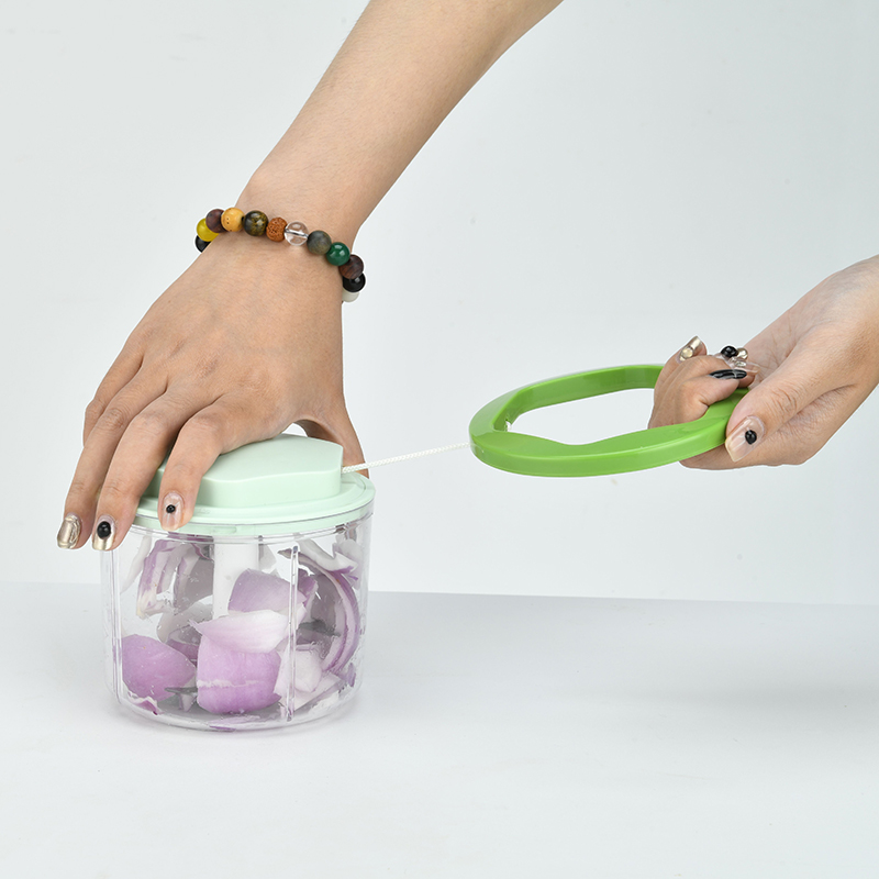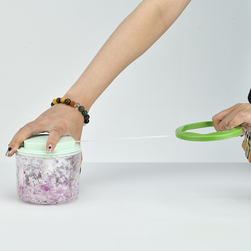 A pull chopper is a manual food chopper that uses a cord or string to chop food. The food is placed in a cup or bowl with the blade at the bottom. The cord or string is then pulled, which rotates the blade and chops the food. The number of times the cord is pulled determines the coarseness of the chop.
