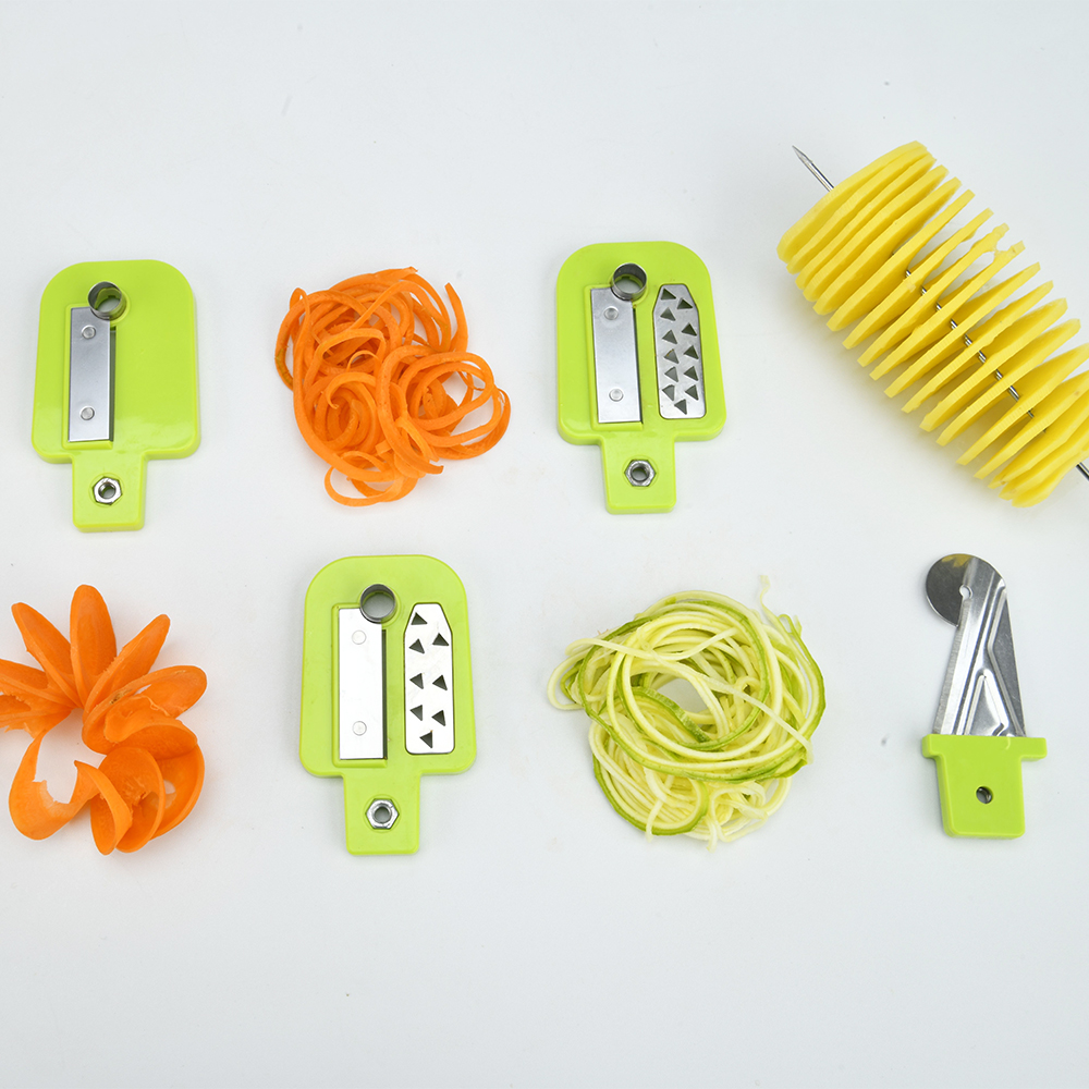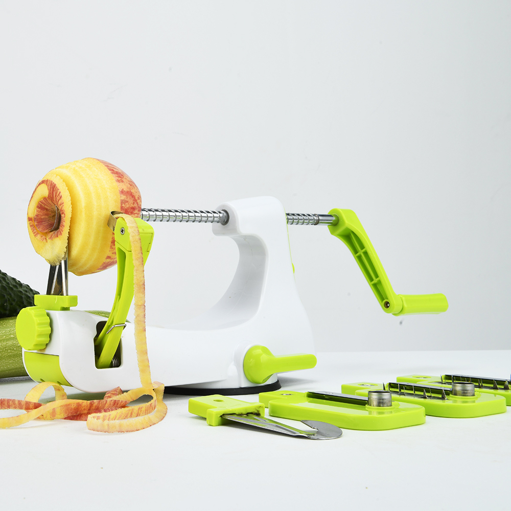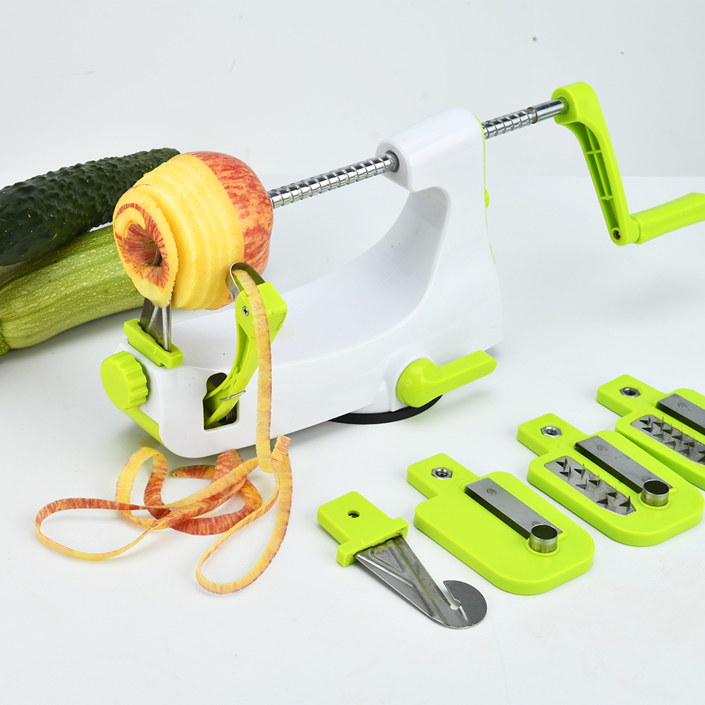Features & Functions: Contains 5 blades Core and slice apples in a snape.Peel and spirailze vegetables with ease. Includes various Stainless steel blades for slicing,coring,peeling,ribbon cuts and long thin cuts.